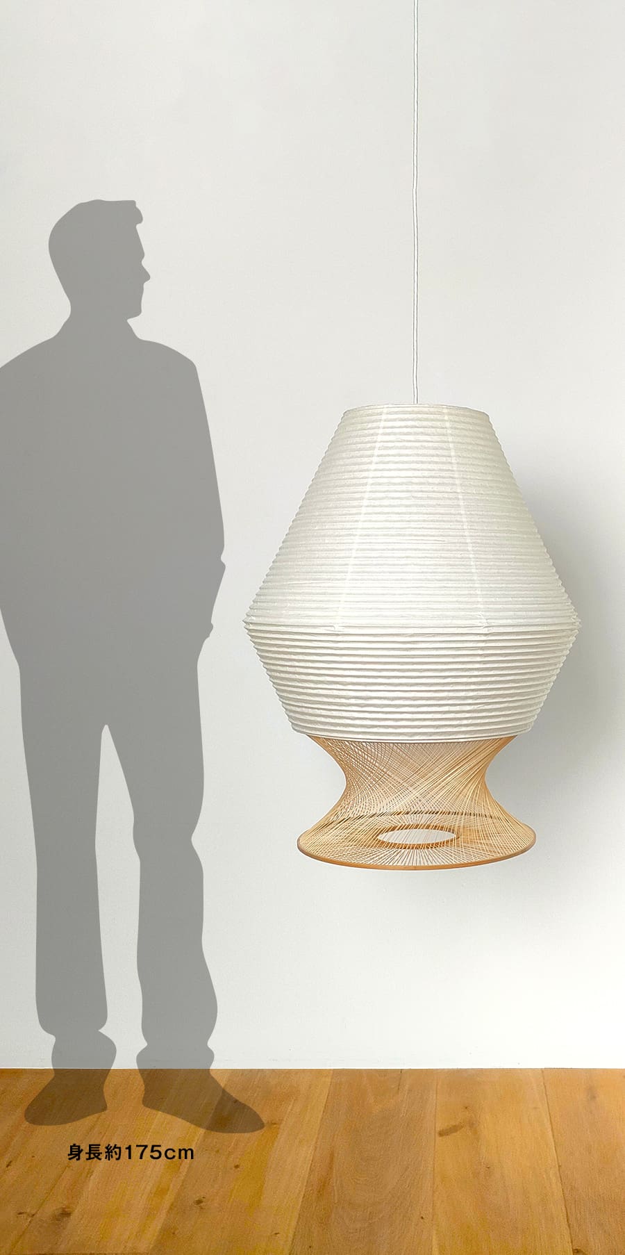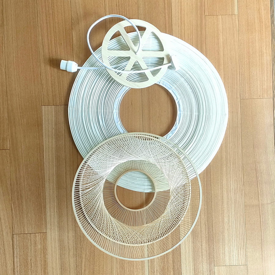 通常の和紙提灯では、竹や針金のヒゴが用いられますが、本作では PET樹脂製のヒゴに薄い和紙を巻き付けることで、やわらかな質感を生み出しつつ、ひご自体が落とす影を抑えています。