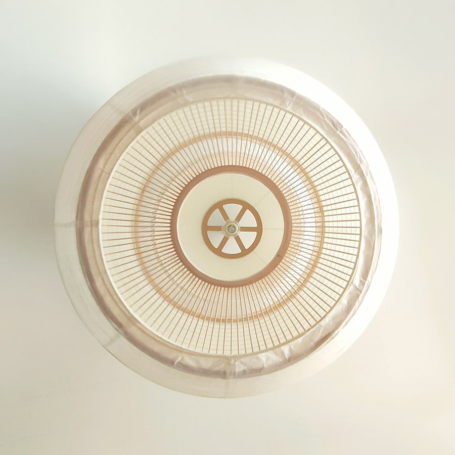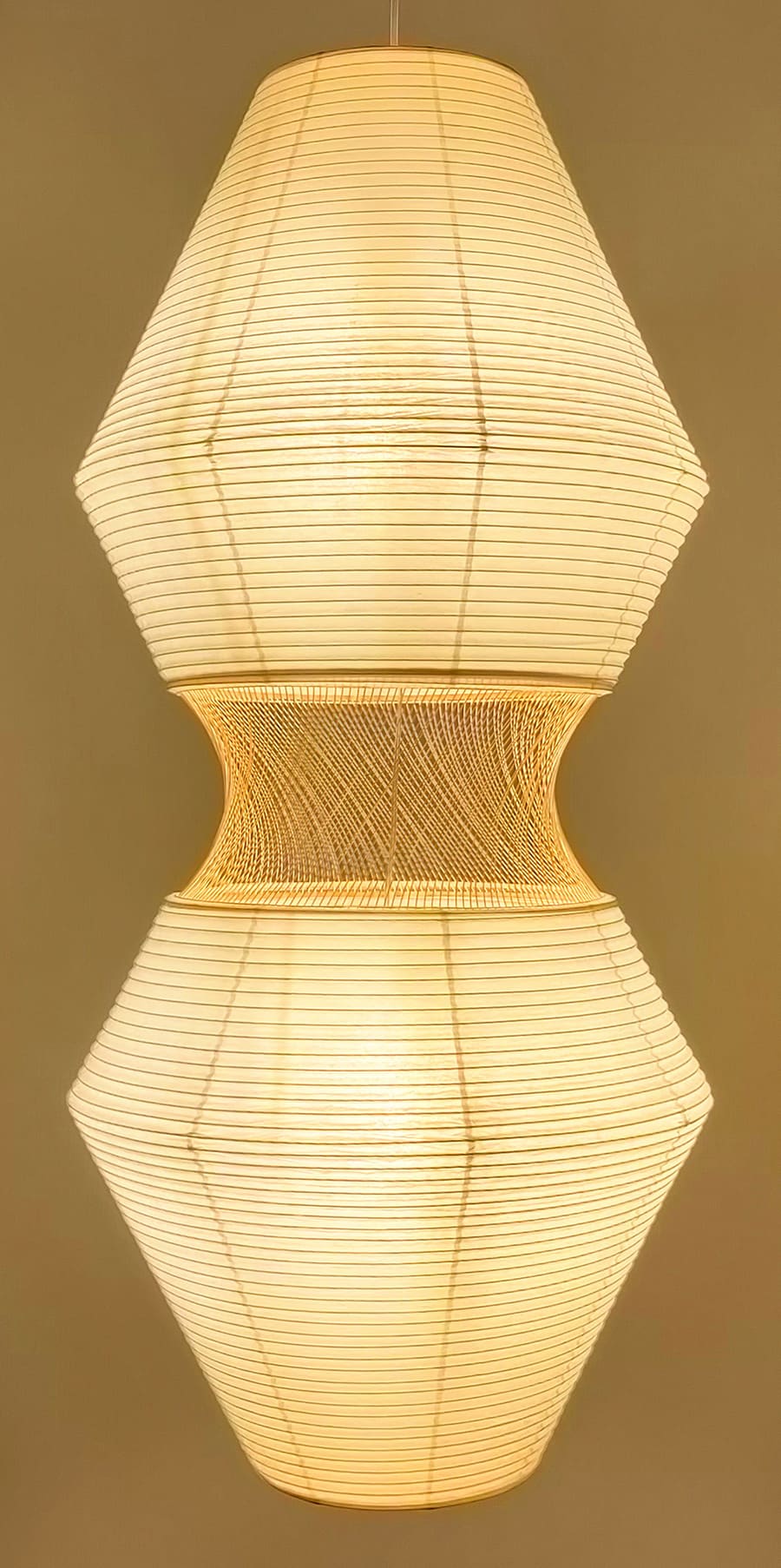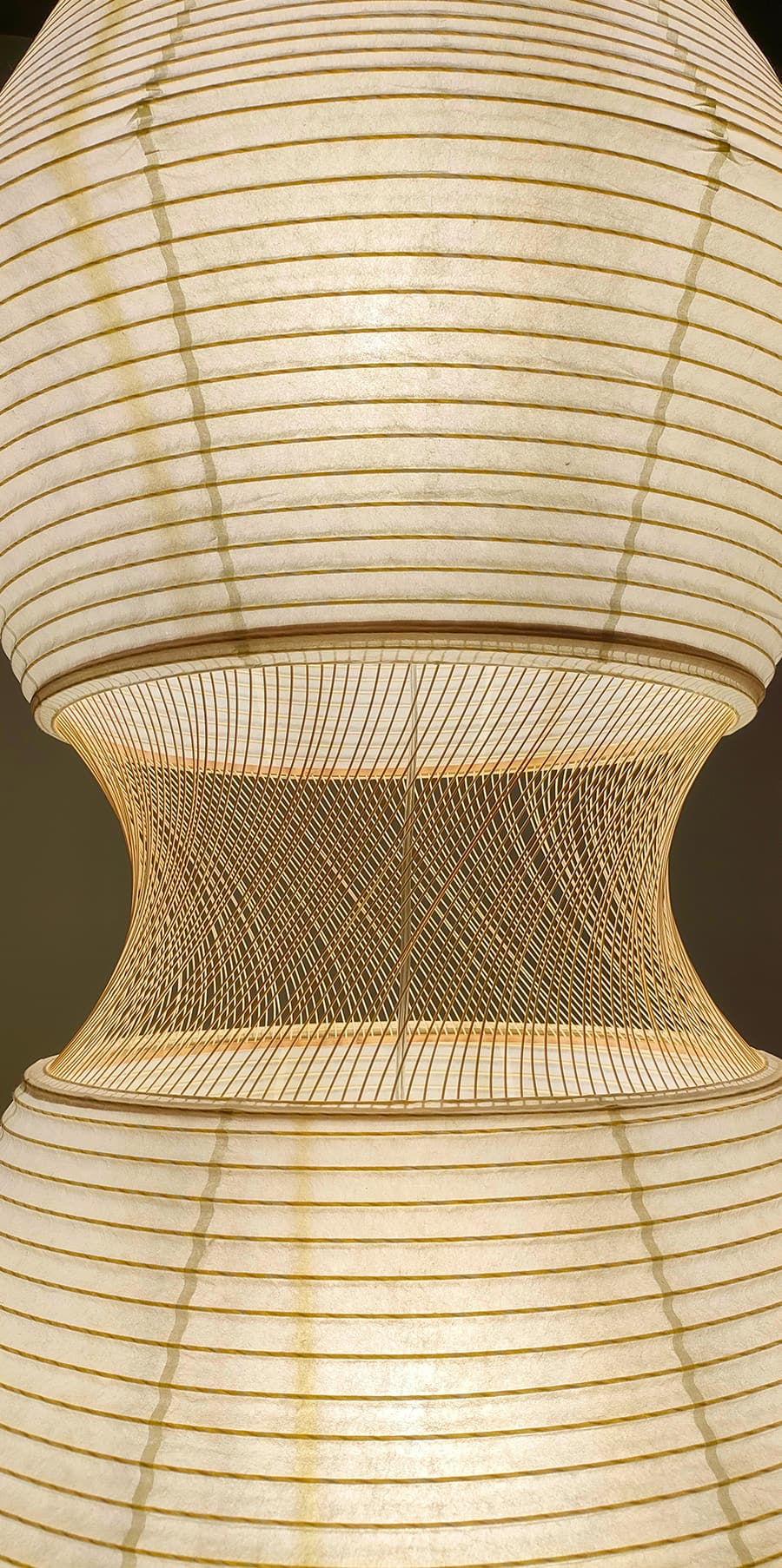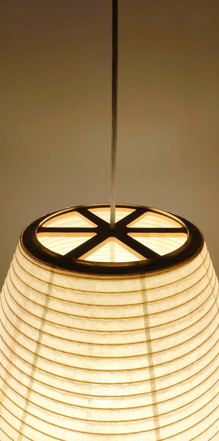 通常の和紙提灯では、竹や針金のヒゴが用いられますが、本作では PET樹脂製のヒゴに薄い和紙を巻き付けることで、やわらかな質感を生み出しつつ、ひご自体が落とす影を抑えています。