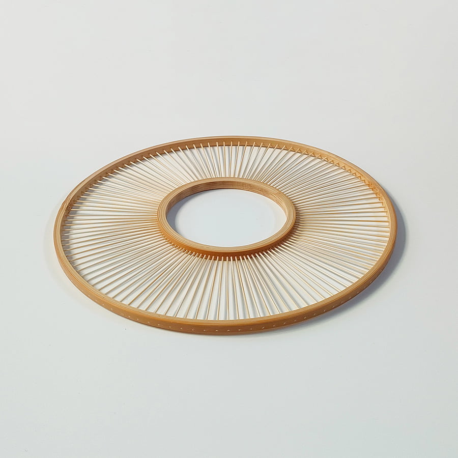 竹が本来持っている“しなり”だけに委ね、ゆっくりと曲げています。そのため、曲線は決して均一ではなく、場所によってわずかな揺らぎや個体差が生まれます。けれどそれは、自然が描いた線そのものです。